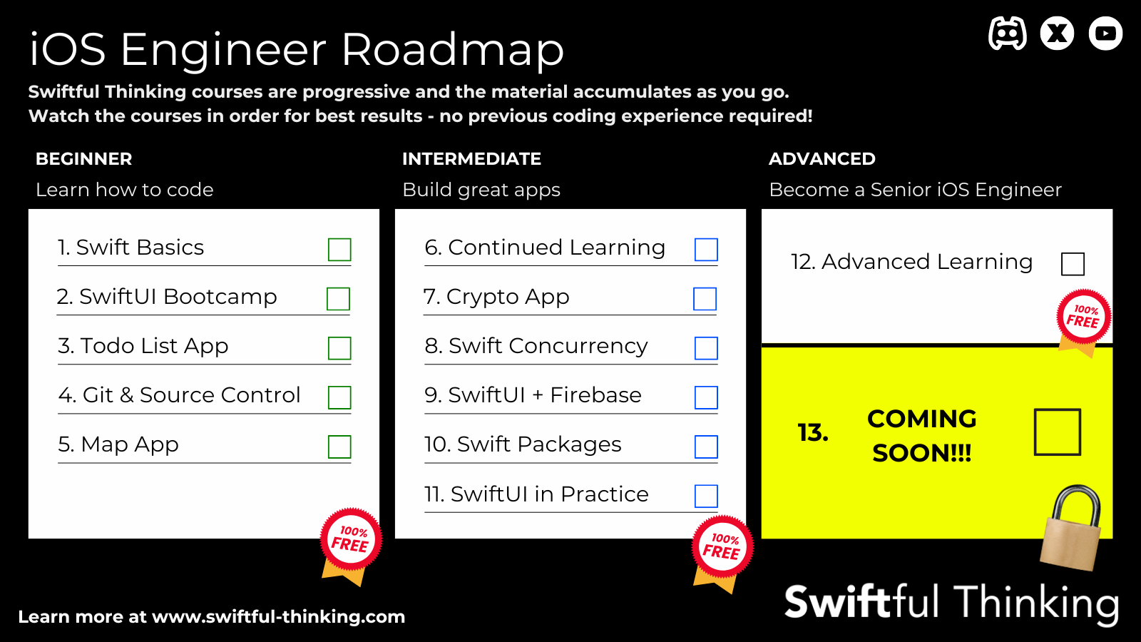 For those following Swiftful Thinking, hereβs a useful milestone roadmap to guide your progress: